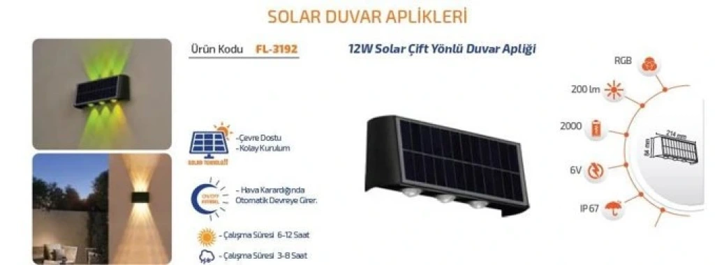 12W Solar Duvar Apliği ; 200lm ; RGB